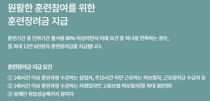 원활한 훈련참여를 위해 훈련장려금도 지급됩니다. 훈련기간 중 단위기간 출석률이 80% 이상이면서, 140시간 이상 훈련과정을 수강하는 실업자, 주 15시간 미만 근로하는 피보험자, 근로장려금 수급자 등은 월 최대 11만 6천원의 훈련장려금을 받을 수 있습니다. 또한 자영업자인 고용보험 피보험자(월 최대 36만원)나 장애인 취업성공패키지 참여자도 훈련장려금을 받을 수 있습니다.