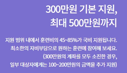국민내일배움카드는 카드 한 장으로 시작하는 다양한 훈련을 지원합니다. 지원 기간은 5년간이며, 대상은 누구나(일부 제외) 신청할 수 있습니다. 지원금액은 300만원에서 500만원까지 입니다.