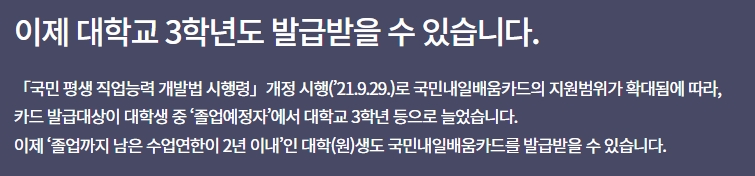 카드 발급은 국민 평생 직업능력 개발법 시행령 개정 시행에 따라, 대학교 3학년 이상부터 가능합니다. 졸업까지 남은 수업 연한이 2년 이내인 대학(원)생도 국민내일배움카드를 발급받을 수 있습니다.