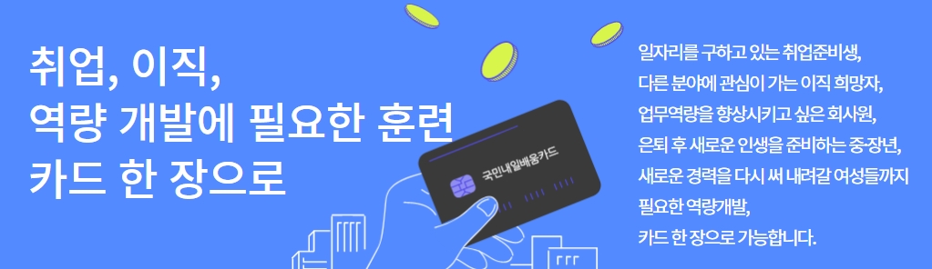 이 카드로 취업, 이직, 역량 개발에 필요한 훈련을 받을 수 있습니다. 일자리를 구하는 취업준비생, 다른 분야에 관심이 있는 이직 희망자, 업무역량을 향상시키고 싶은 회사원, 은퇴 후 새로운 인생을 준비하는 중·장년, 새로운 경력을 다시 써 내려갈 여성들까지 다양한 사람들이 필요한 역량을 개발할 수 있습니다.