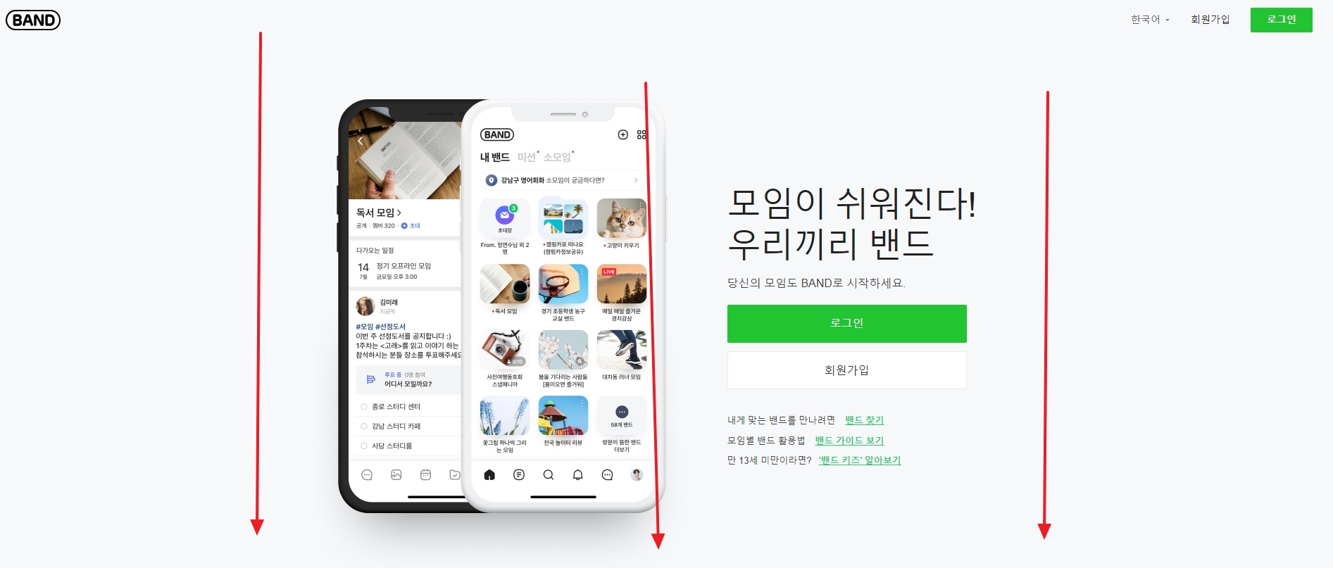 네이버 밴드를 검색해서 홈페이지로 들어갑니다. 동호회, 스터디, 주제별 모임, 멤버 초대, 사진, 일정, 공지사항, 다운로드 안내 등의 정보가 있습니다.