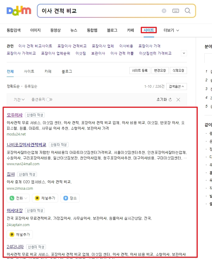 그리고 본인의 지역에서 이사라고 검색을 합니다. 이렇게 검색하면 근처에 있는 이사 업체들을 쉽게 찾을 수 있습니다.