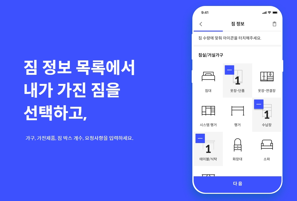 짐 정보 목록에서 내가 가진 짐을 선택하게 되는데 보통 침대, 옷장 등이 가격이 추가로 더 붙는 경우이기 때문에 이런 식으로도 사실 견적이 얼추 가능합니다. 구체적으로 입력하면 보다 정확한 견적을 받을 수 있습니다.