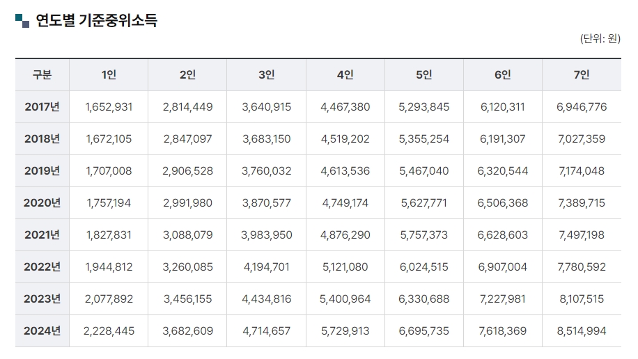 연도별 기준 중위소득을 보면, 2024년에는 다음과 같이 결정되었습니다: