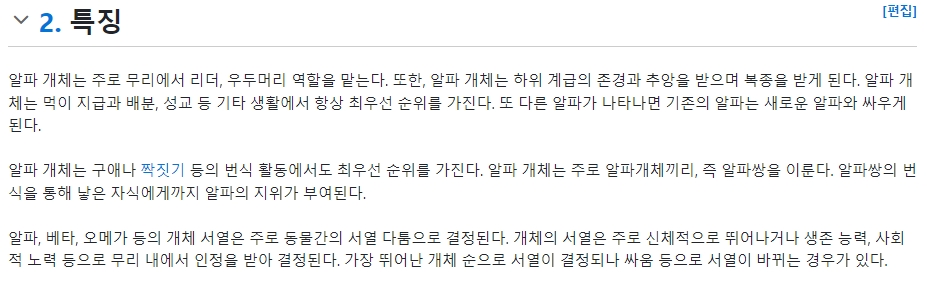 알파 개체는 주로 무리에서 리더, 우두머리 역할을 맡습니다. 또한, 알파 개체는 하위 계급의 존경과 추앙을 받으며 복종을 받게 됩니다. 알파 개체는 먹이 지급과 배분, 성교 등 기타 생활에서 항상 최우선 순위를 가집니다. 또 다른 알파가 나타나면 기존의 알파는 새로운 알파와 싸우게 됩니다. 알파 개체는 구애나 짝짓기 등의 번식 활동에서도 최우선 순위를 가집니다. 알파 개체는 주로 알파 개체끼리, 즉 알파 쌍을 이룹니다. 알파 쌍의 번식을 통해 낳은 자식에게까지 알파의 지위가 부여됩니다. 알파, 베타, 오메가 등의 개체 서열은 주로 동물 간의 서열 다툼으로 결정됩니다. 개체의 서열은 주로 신체적으로 뛰어나거나 생존 능력, 사회적 노력 등으로 무리 내에서 인정을 받아 결정됩니다. 가장 뛰어난 개체 순으로 서열이 결정되나 싸움 등으로 서열이 바뀌는 경우가 있습니다.