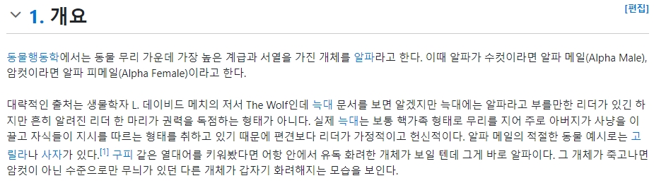 동물행동학에서는 동물 무리 가운데 가장 높은 계급과 서열을 가진 개체를 알파라고 합니다. 이때 알파가 수컷이라면 알파 메일(Alpha Male), 암컷이라면 알파 피메일(Alpha Female)이라고 합니다. 대략적인 출처는 생물학자 L. 데이비드 메치의 저서 The Wolf인데, 늑대 문서를 보면 알겠지만 늑대에는 알파라고 부를만한 리더가 있긴 하지만 흔히 알려진 리더 한 마리가 권력을 독점하는 형태가 아닙니다. 실제 늑대는 보통 핵가족 형태로 무리를 지어 주로 아버지가 사냥을 이끌고 자식들이 지시를 따르는 형태를 취하고 있기 때문에 편견보다 리더가 가정적이고 헌신적입니다. 알파 메일의 적절한 동물 예시로는 고릴라나 사자가 있습니다. 구피 같은 열대어를 키워봤다면 어항 안에서 유독 화려한 개체가 보일 텐데 그게 바로 알파입니다. 그 개체가 죽고 나면 암컷이 아닌 수준으로만 무늬가 있던 다른 개체가 갑자기 화려해지는 모습을 보입니다.