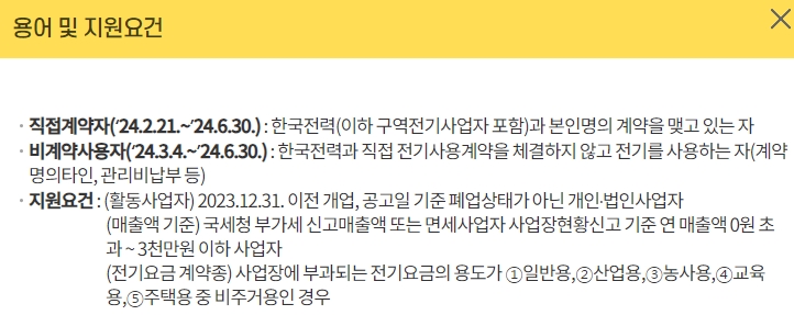 자가진단 후 사업자 번호를 등록하고 신청 절차를 진행합니다. 직접계약자와 비계약사용자 지원 요건은 다르며, 지원 요건에 맞는지 확인해야 합니다. 지원 요건에는 2023년 12월 31일 이전 개업, 연 매출 0원 초과 3천만 원 이하, 전기요금의 용도가 일반용, 산업용, 농사용, 교육용, 비주거용 주택용인 경우 등이 포함됩니다.
