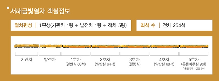기관차와 발전차를 제외하고 1호차부터 5호차까지의 정보가 있으며, 5호차에는 온돌마루 9실이 있습니다. 각 객실마다 특색 있는 디자인과 편의시설이 마련되어 있어 여행의 즐거움을 더해줍니다.