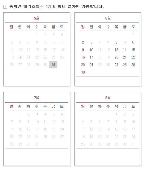 승차권 예약은 1개월 이내만 가능하며, 원하는 날짜를 클릭합니다. 예약 가능 날짜를 미리 확인하고 계획을 세우는 것이 좋습니다.
