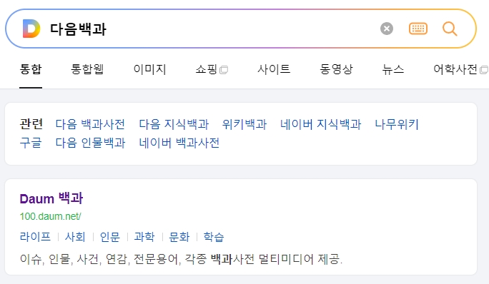 다음백과 홈페이지로 들어갑니다. 여기서는 다양한 이슈, 인물, 사건, 연감, 전문용어, 각종 백과사전, 멀티미디어 등을 제공합니다