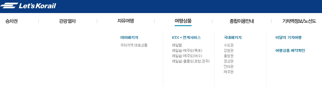 레츠코레일을 검색해서 들어갑니다. 여기서는 승차권, 관광열차, 기차여행상품, 내일로, 유럽패스, 레일티켓, 커뮤니티, 기차역 안내 등의 다양한 서비스를 제공합니다.