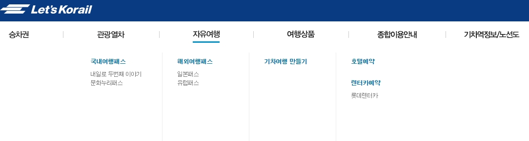 자유여행 메뉴가 보입니다. 국내여행패스, 해외여행패스, 기차여행 만들기, 호텔예약, 렌터카예약 등 다양한 여행 관련 서비스를 제공합니다. 특히, 내일로 두번째 이야기, 문화누리패스 등 국내여행에 특화된 패스도 안내하고 있습니다.