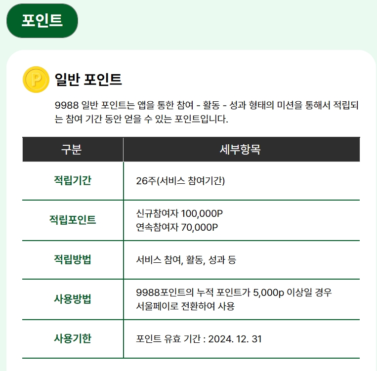 앱에 로그인하여 서비스를 개시합니다. 보급밴드를 스마트폰과 손목닥터9988 앱과 연동한 후, 로그인하여 서비스를 시작합니다. 9988 일반 포인트는 앱을 통한 참여, 활동, 성과 형태의 미션을 통해 적립되며, 참여 기간 동안 얻을 수 있는 포인트입니다. 적립기간은 26주로, 신규참여자는 100,000포인트, 연속참여자는 70,000포인트를 적립할 수 있습니다. 포인트는 서비스 참여, 활동, 성과 등을 통해 적립되며, 누적 포인트가 5,000포인트 이상일 경우 서울페이로 전환하여 사용할 수 있습니다. 포인트 유효 기간은 2024년 12월 31일까지입니다.
