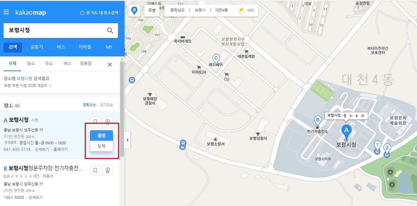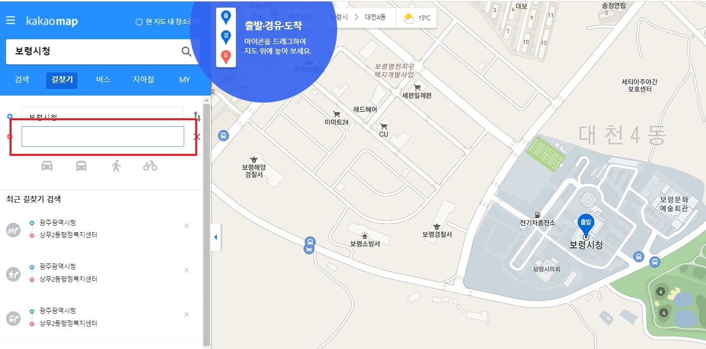 출발지와 도착지를 설정합니다. 예시로 보령시청을 출발지로 설정하고 길찾기 기능을 활용할 수 있습니다. 이는 사용자가 특정 목적지까지의 경로를 찾는데 도움을 줍니다.