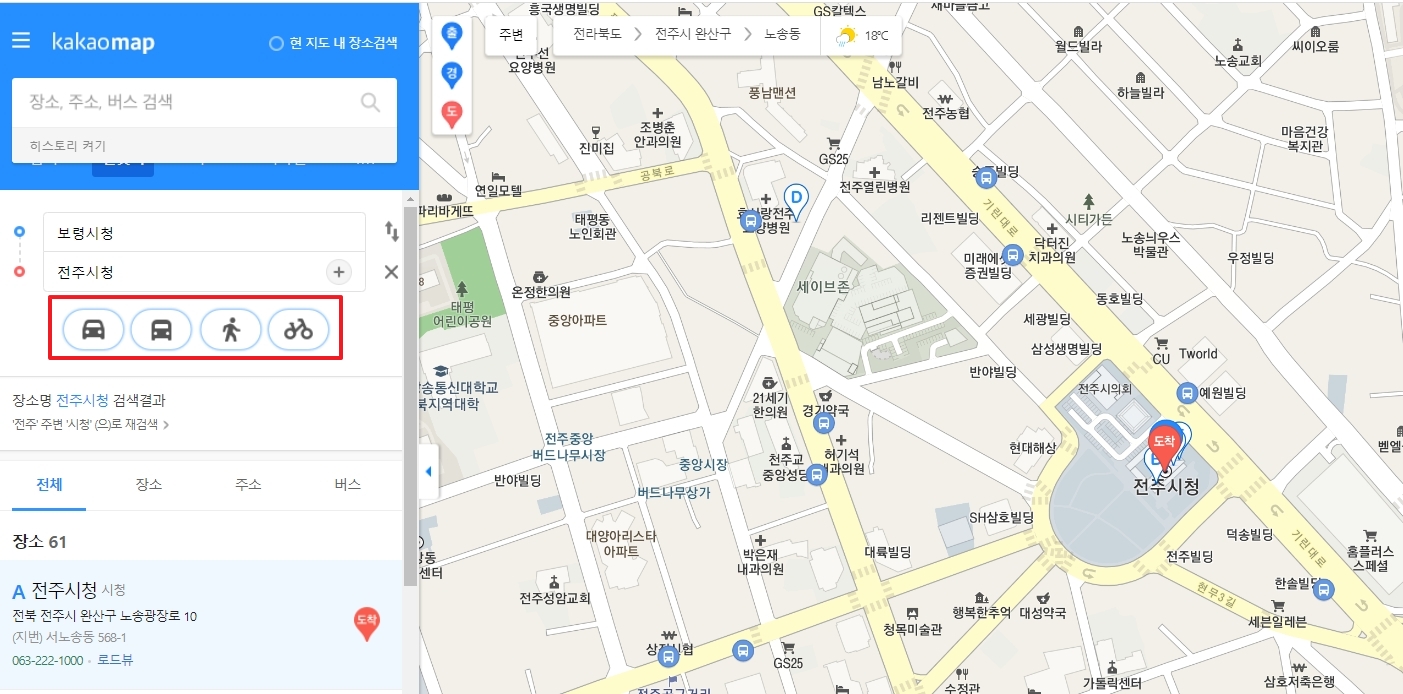 카카오맵에 접속합니다. 카카오맵은 경로 탐색, 위치 검색, 주변 시설 정보 제공 등 다양한 기능을 갖춘 지도 서비스 어플리케이션으로, 자동차 뿐만 아니라 대중교통, 도보, 자전거 등 다양한 이동 수단에 대한 정보를 제공합니다