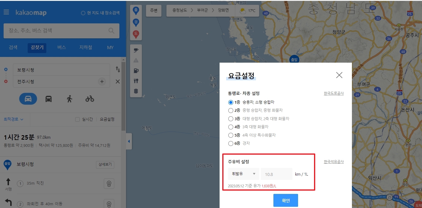 주유비 정보를 확인합니다. 카카오맵에서 제공하는 주유비 정보는 사용자가 차량 이동에 드는 비용을 대략적으로 계산하는 데 도움을 줍니다.