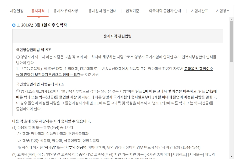 먼저 응시자격부터 살펴보면 2016년 3월 1일 이후 입학자 응시자격은 국민영양관리법 제15조에 따라 정해집니다. 영양사가 되려면 영양사 국가시험에 합격한 후 보건복지부장관의 면허를 받아야 합니다. 고등교육법에 따른 대학, 산업대학, 전문대학 또는 방송통신대학에서 식품학 또는 영양학을 전공해야 하며, 교과목과 학점 이수 요건을 충족해야 합니다.