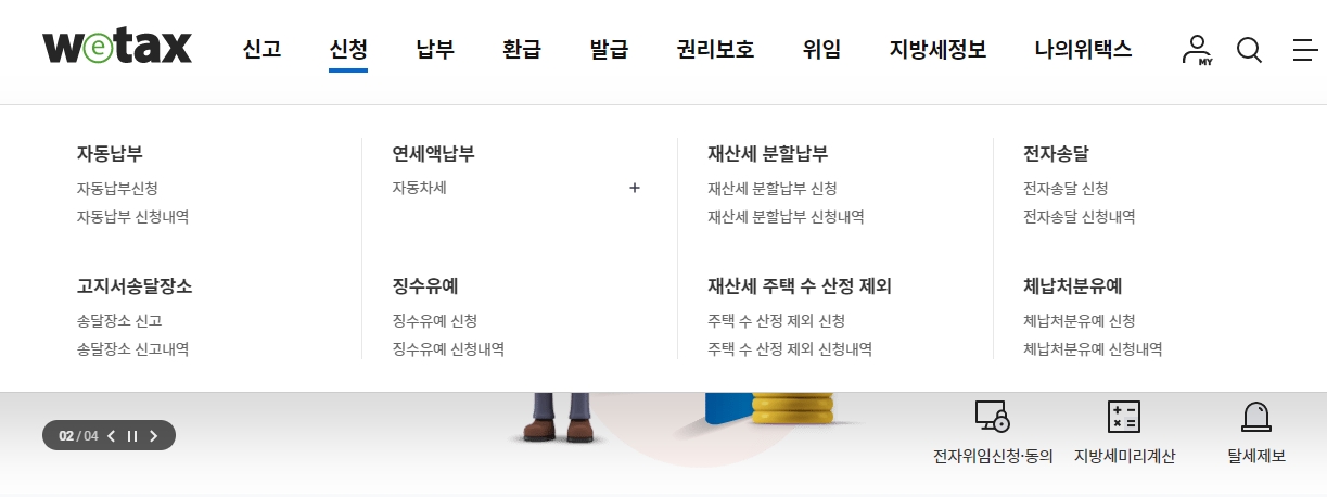 4. 신청 메뉴에서는 자동차납부, 연세액납부, 고지서송달장소, 징수유예, 재산세 분할납부, 재산세 주택 수 산정 제외, 전자송달, 체납처분유예 등을 신청할 수 있습니다.