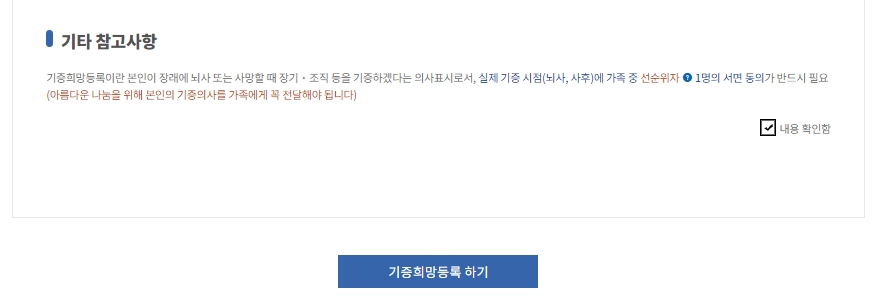 6. 마지막으로 기증희망 등록하기 버튼을 누르고 필요한 정보를 입력하면 신청이 차례대로 진행됩니다. 이제 기증희망 등록하기 버튼을 클릭하고 필요한 정보를 입력합니다. 여기에는 이름, 연락처, 주소 등 기본적인 정보가 포함됩니다. 모든 정보를 정확하게 입력한 후, 제출 버튼을 누르면 장기기증 희망 등록이 완료됩니다.