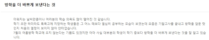 4. 첫 번째 인사말은 방학을 더 바쁘게 보낸다는 것입니다. 더워지는 날씨만큼 학습 의욕도 떨어지기 쉬운 시기입니다. 학기 초에 특목고를 지망하던 학생들은 열심히 공부했지만, 요즘은 기말고사와 방학을 앞두고 처음의 열정이 보이지 않아 안타깝습니다. 7월의 여름방학은 학교에 오지 않는 기쁨도 있지만, 대부분의 학생이 학기 중보다 방학을 더 바쁘게 보낸다는 것을 잘 알고 있습니다.