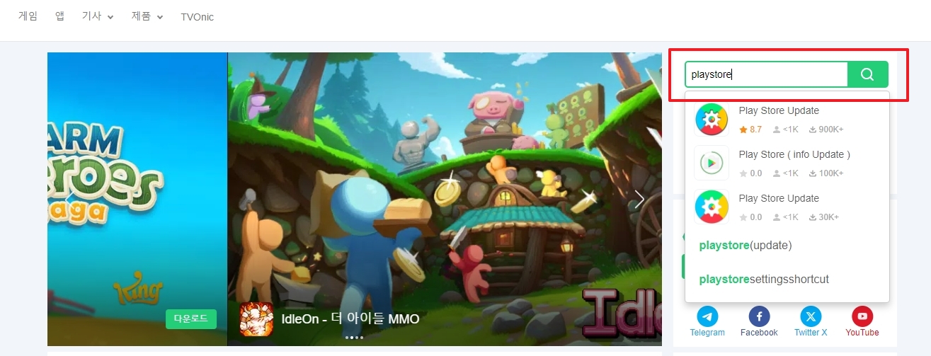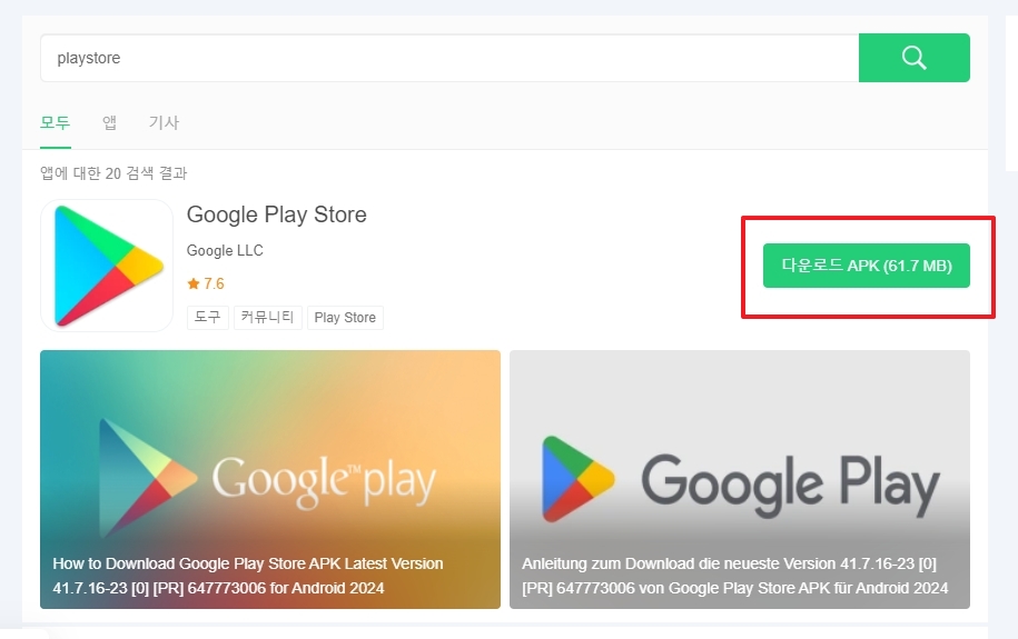 3. 홈페이지 검색창에 playstore를 입력하고 검색합니다. 검색 결과에서 구글 플레이스토어 APK 파일을 찾습니다.