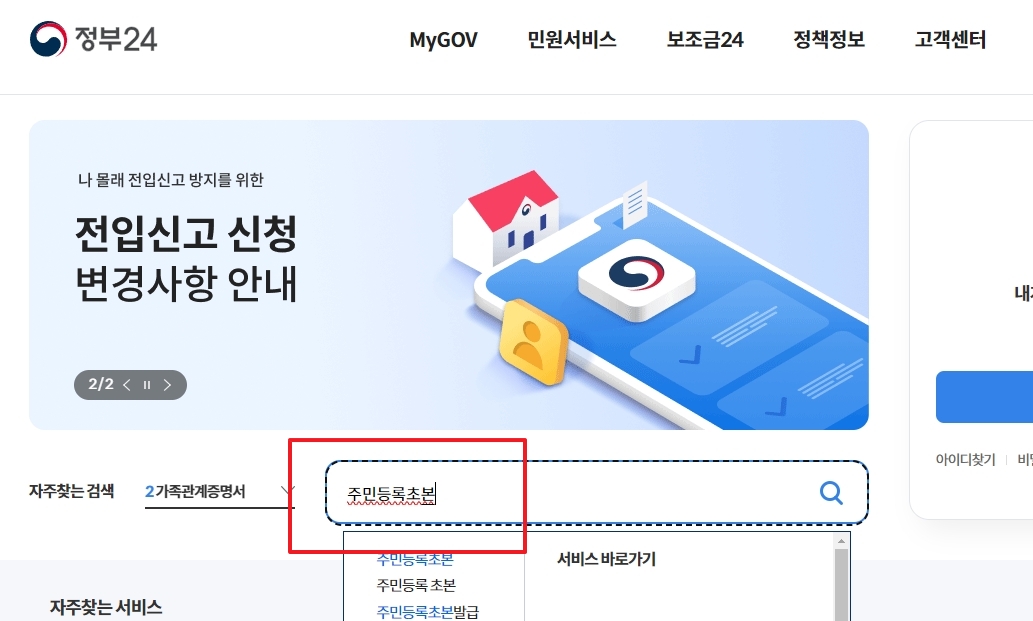 2. 홈페이지 상단의 검색창에 주민등록초본을 입력하고 검색합니다. 검색 결과에서 관련 민원서비스를 쉽게 찾을 수 있습니다.