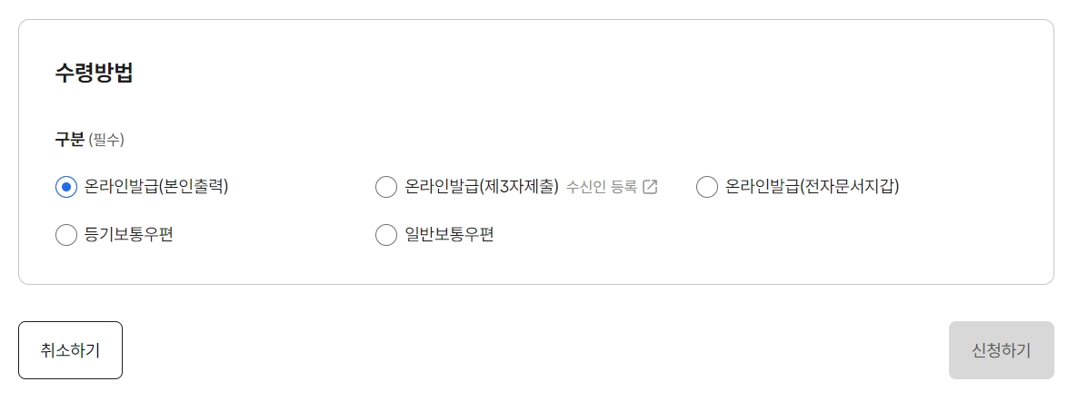 8. 수령방법을 선택합니다. 온라인발급(본인출력), 온라인발급(제3자제출), 온라인발급(전자문서지갑), 등기보통우편, 일반보통우편 중에서 선택할 수 있습니다. 모든 설정을 완료한 후 신청하기 버튼을 클릭하여 발급 절차를 완료합니다. 필요한 경우 취소하기 버튼을 클릭할 수도 있습니다.