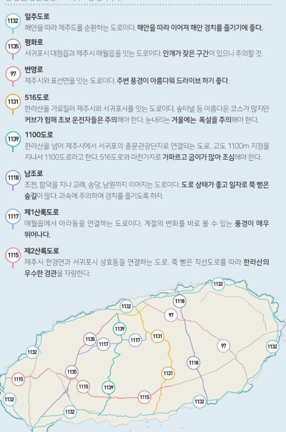 8. 제주도 여행지도중 도로에 관해서도 설명이 나오는데 렌트를 하는 경우라면 제주도 길을 대충으로라도 눈에 익혀두어야 합니다. 제주도는 도로상황이 그렇게 좋지 않아서 가로지르는 것이 거의 없기에 동서남북으로 나누어서 한 쪽만 여행하고 오라는 이야기를 많이 하곤 합니다.
