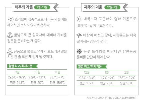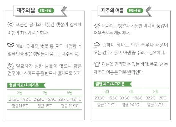 6. 날씨에 대한 간략한 정보도 제공되며, 제주도 날씨의 변화무쌍함과 지역에 따른 온도 차이에 대해 알 수 있습니다.