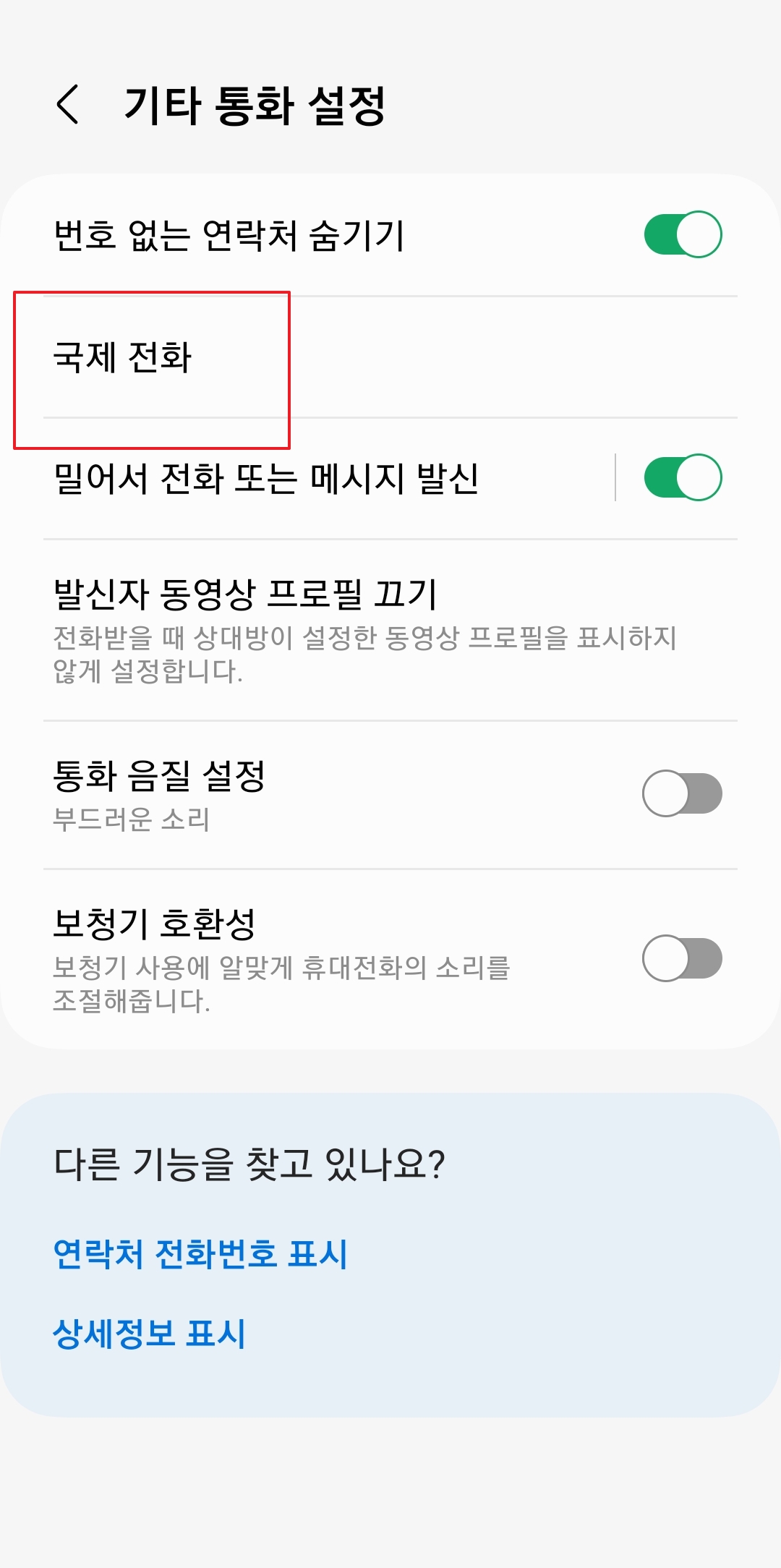 4. '기타 통화 설정' 메뉴로 들어가면 '국제전화'라는 옵션이 있습니다. '국제전화' 옵션을 클릭하면 '발신전화 차단'과 '수신전화 차단' 메뉴가 나타납니다. 이 두 가지 옵션을 모두 켜면 국제전화를 걸지도 못하고 받지도 못하게 됩니다.