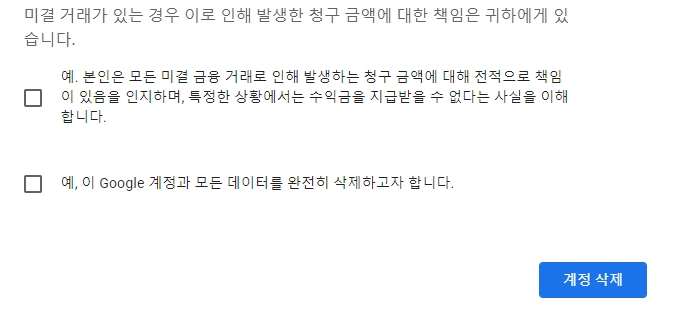 10. 마지막으로 체크박스 두 개를 체크한 뒤에 '계정 삭제' 버튼을 클릭하면 완료됩니다. 모든 절차를 마치면 계정이 삭제돼요. 신중하게 확인하고 진행하세요!