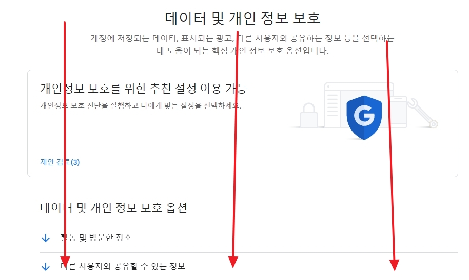 로그인이 완료되면 오른쪽 상단에 프로필 사진이나 이니셜이 보일 거예요. 그것을 클릭합니다. 작은 창이 열리면 'Google 계정 관리' 버튼을 클릭합니다. 화면이 이동되면 왼쪽에 여러 메뉴가 보일 것입니다. 그중에서 '데이터 및 개인 정보 보호'를 클릭합니다.