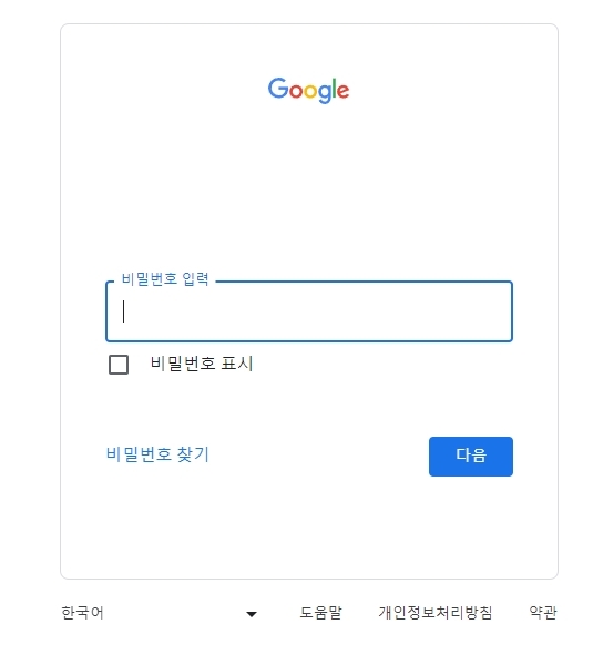 4. 이제 비밀번호를 입력합니다. 여기까지 하면 보통 로그인이 완료돼요. 로그인된 구글 계정은 기본적으로 브라우저를 종료해도 로그인이 풀리지 않아요. 자동 로그인 기능이 기본으로 설정되어 있어서 그렇습니다.