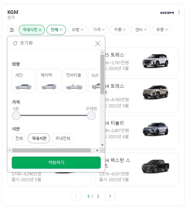 2. 네이버 검색창에 쌍용 자동차 종류를 입력하고 검색하면 현재 국내 시판 중인 쌍용 자동차들이 나와요. 다양한 모델들이 한눈에 보이니까 정말 편리해요. 여기서 내가 원하는 모델을 찾을 수 있어요.
