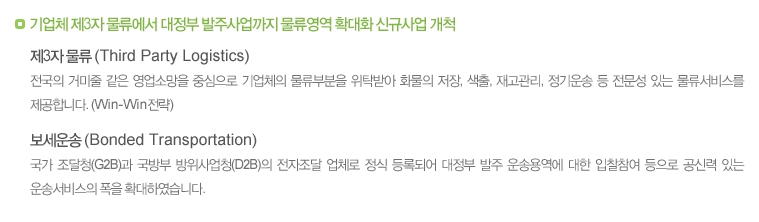 대신화물은 기업체 제3자 물류 및 대정부 발주사업까지 물류 영역을 확대하고 신규사업을 개척하고 있습니다. 그러나 택배 서비스와 관련해서는 CJ, 롯데, 한진, 우체국 등이 주로 떠오르며, 과거에 비해 다양한 택배 업체 중 상위 몇 개의 업체만이 주목받는 현상이 있습니다.