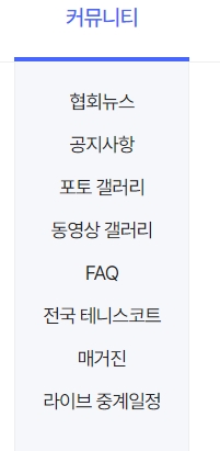 6. 커뮤니티 메뉴에서는 협회 뉴스와 공지사항, 그리고 다양한 사진과 영상을 감상할 수 있는 포토 갤러리와 동영상 갤러리가 있어요. 전국의 테니스 코트 정보와 라이브 중계 일정도 여기서 확인할 수 있습니다. ㅠ