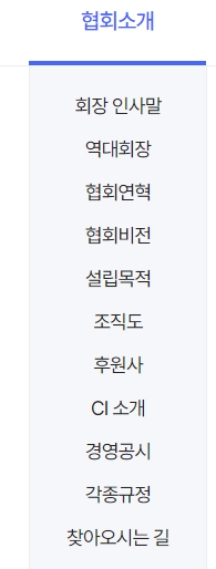2. 협회 소개 메뉴에서는 협회의 회장 인사말, 연혁, 비전 등을 볼 수 있어요. 또한, 설립 목적과 조직도, 후원사 정보도 상세하게 나와 있어서 협회가 어떤 목표를 가지고 운영되는지 알 수 있습니다.