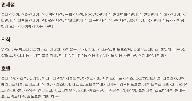 대부분의 면세점에서 국민관광상품권을 사용할 수 있으며, 특히 인천공항 내 모든 면세점에서 사용이 가능합니다. 또한, 빕스, 아웃백, 애슐리, 자연별곡 등 주요 외식업체에서도 사용이 가능합니다.