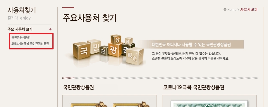 좌측 메뉴에서는 일반 국민관광상품권과 코로나19 극복 국민관광상품권 등 다양한 종류의 상품권이 확인 가능합니다. 사용처를 확인하기 위해서는 상단 메뉴에서 사용처 찾기를 클릭한 후 좌측 메뉴를 통해 상세 검색을 해야 합니다.