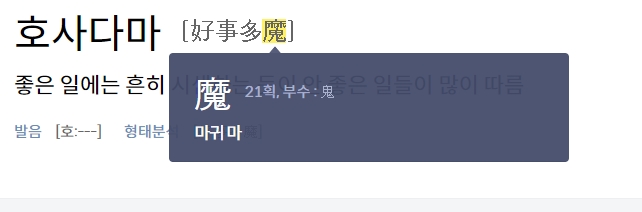 3. 검색 결과로 호사다마의 의미가 나타납니다. 이 단어는 좋은 일에는 흔히 시샘하는 듯이 안 좋은 일들이 많이 따름이라는 뜻을 가지고 있어요. 한자로는 好事多魔로 표현되며, 좋은 일에는 많은 장애가 따를 수 있다는 교훈을 담고 있습니다.