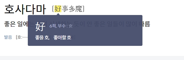 6. 호사다마의 한자를 살펴보면 첫 번째 글자인 호(好)는 좋을 호, 좋아할 호를 의미합니다. 이 글자는 좋은 일이나 사람을 나타낼 때 사용됩니다.