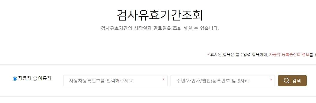 3. 페이지에 접속하면 검사유효기간 조회 페이지가 나타납니다. 이 페이지에서는 검사유효기간의 시작일과 만료일을 조회할 수 있습니다. 조회를 위해서는 자동차 등록번호와 주민등록번호 앞 6자리를 입력해야 합니다. 검색 버튼을 눌러 정보를 확인할 수 있습니다.