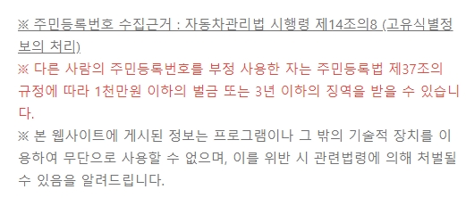 4. 또한, 페이지 하단에서는 주민등록번호 수집 근거와 관련 법률을 확인할 수 있으며, 주민등록번호를 부정 사용했을 경우 받을 수 있는 처벌에 대한 경고도 명시되어 있습니다. 개인 정보 보호와 관련된 주의사항을 꼭 숙지하셔야 합니다.