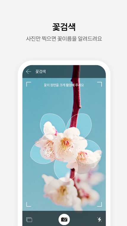 8. 꽃의 종류를 바로 검색하고 싶다면 카메라로 사진을 찍을 수 있으며, 미리 찍어둔 사진이 있다면 좌측 하단에 있는 사진 모양 아이콘을 클릭하여 갤러리에서 선택할 수 있습니다.