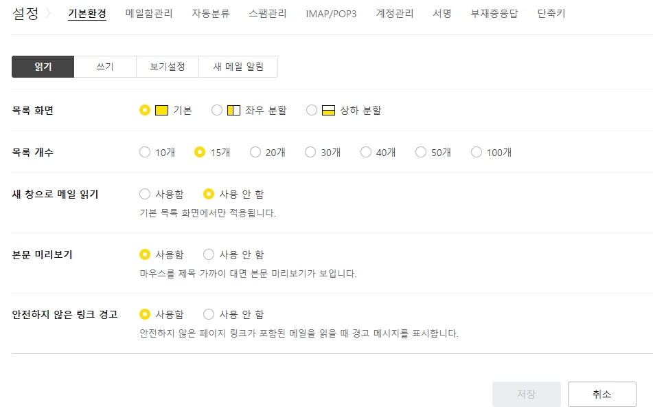 4. 기본 환경 설정에서는 메일을 읽고 쓰는 화면을 사용자에게 맞게 설정할 수 있어요. 목록 화면의 위치, 목록에 표시할 메일의 개수, 새 창으로 메일 읽기 옵션, 본문 미리보기 설정 등을 조정하여 메일을 더욱 편리하게 이용할 수 있습니다. 또한, 안전하지 않은 링크 경고 기능을 통해 보안을 강화할 수 있어요.