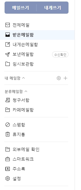 3. 받은메일함에서는 받은 메일들을 한눈에 관리할 수 있습니다. 내게쓴메일함, 보낸메일함, 임시보관함 등 다양한 메일함을 통해 메일을 분류하고 관리할 수 있어요. 또한, 청구서함, 카페메일함, 스팸함, 휴지통 등 분류된 메일함도 함께 제공되어 메일 관리를 더 효율적으로 할 수 있습니다.