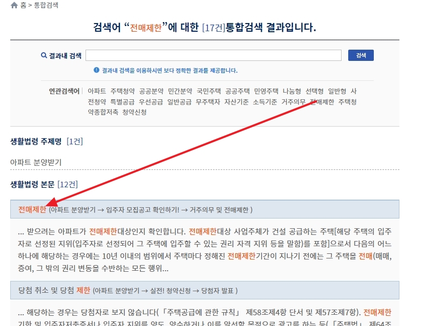 2. 검색창에 전매제한을 입력하고, 검색 결과에서 전매제한이라는 용어를 클릭해요. 이 과정에서 관련 법령과 규정을 확인할 수 있어, 전매제한에 대한 명확한 이해를 돕습니다.