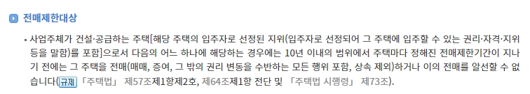 3. 전매제한 대상에 대한 설명을 확인할 수 있어요. 전매제한 대상은 특정 주택을 공급받는 사람에게 일정 기간 동안 해당 주택을 전매할 수 없도록 하는 제한을 말합니다. 이 제한은 주택을 투기 대상으로 활용하는 것을 방지하기 위해 설정되며, 일정한 예외 사항이 존재하기도 합니다.