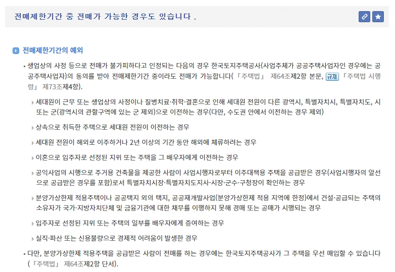 8. 전매제한기간 중 예외적으로 전매가 가능한 경우에 대한 설명이 있어요. 예를 들어, 생업상의 이유로 전매가 불가피한 경우나 특정 조건을 충족하는 경우에는 예외적으로 전매가 허용될 수 있습니다.