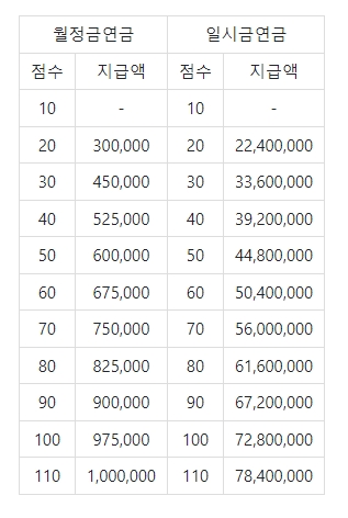 4. 이 연금은 올림픽(하계 및 동계, 패럴림픽 포함), 종목별 세계선수권대회, 아시안 게임(아시아경기대회), 유니버시아드(세계대학생경기대회), 세계군인체육대회 수상자에게 점수를 부여하고, 이 점수에 따라 연금을 지급하는 방식입니다. 연금에는 매월 지급되는 연금월정금과 평가점수에 따라 지급되는 연금일시금이 있습니다. 다만 연금월정금은 최대 100만원으로, 아무리 많은 금메달을 따더라도 월 100만원을 초과할 수 없습니다. 연금월정금 지급 점수(현재 110점)를 초과한 경우, 초과된 점수에 따라 일시금이 지급됩니다.